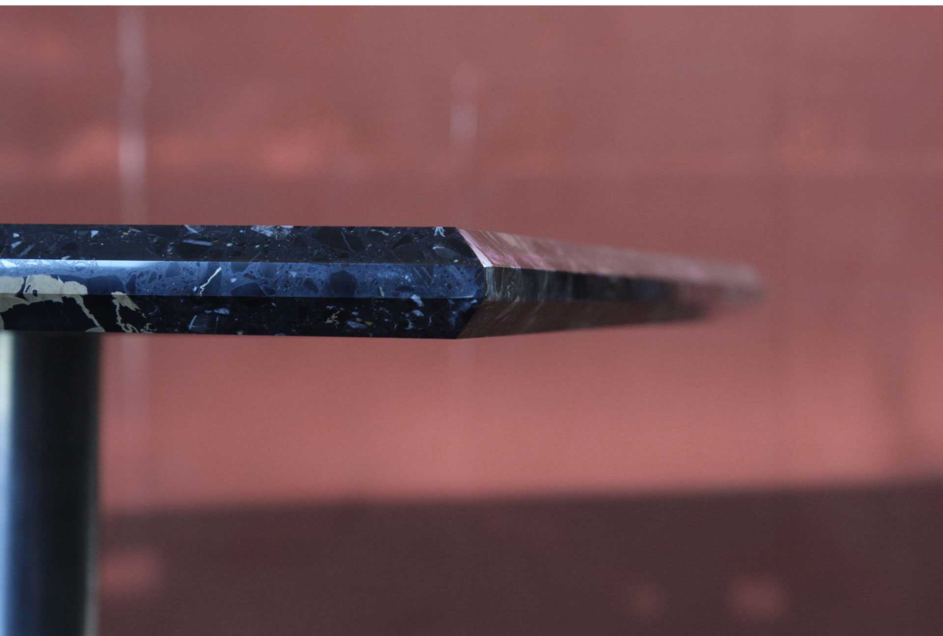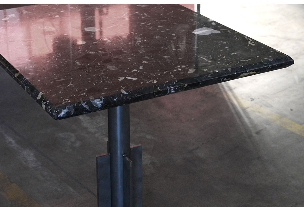 Due colori e due materie caratterizzano tutto il locale: sono il marmo e il legno, che ritroviamo in tutti i materiali. I frontali dei banconi bar e tavoli sono in lamiera cappettata a "V", saldata e verniciata.