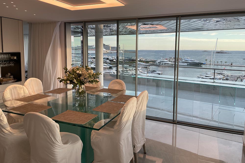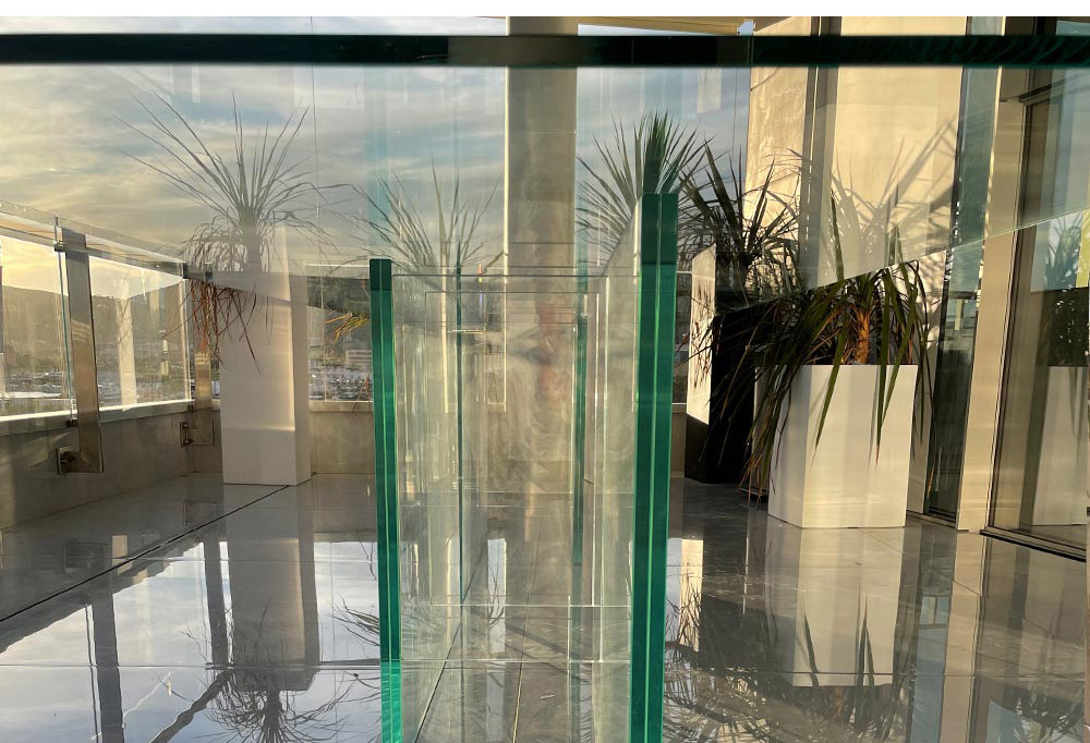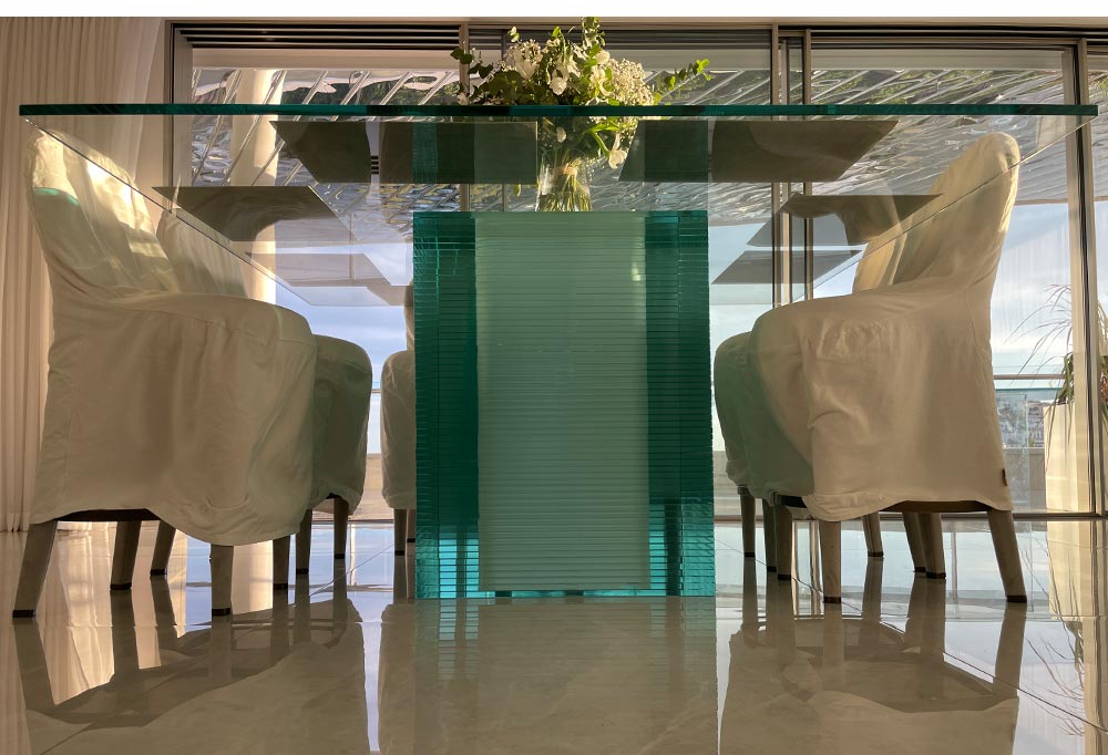 Affacciati su una grande parete vetrata che si specchia sul mar Mediterraneo, questi tavoli realizzati completamente in vetro si confondono tra le profondità del mare e l'infinito del cielo.