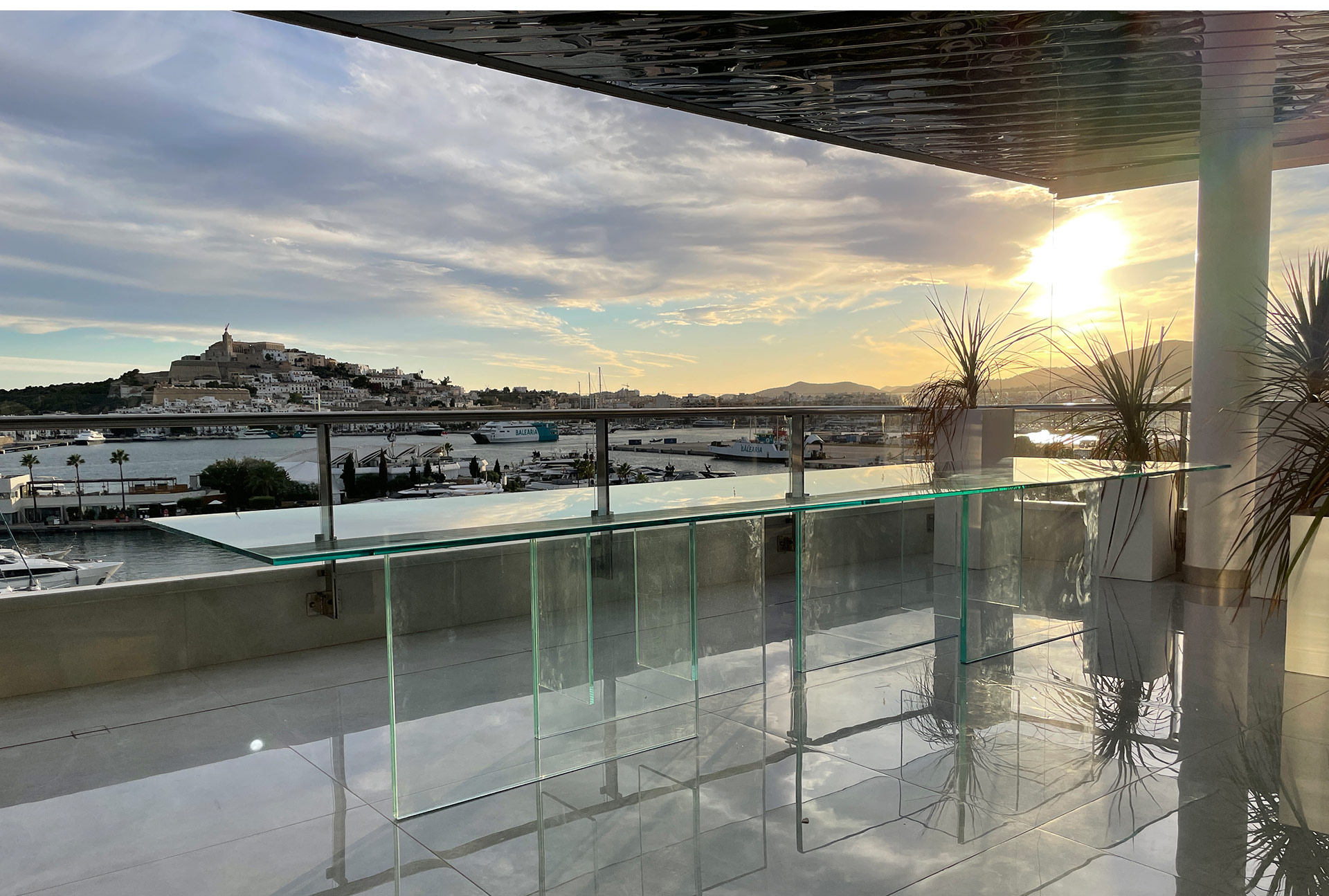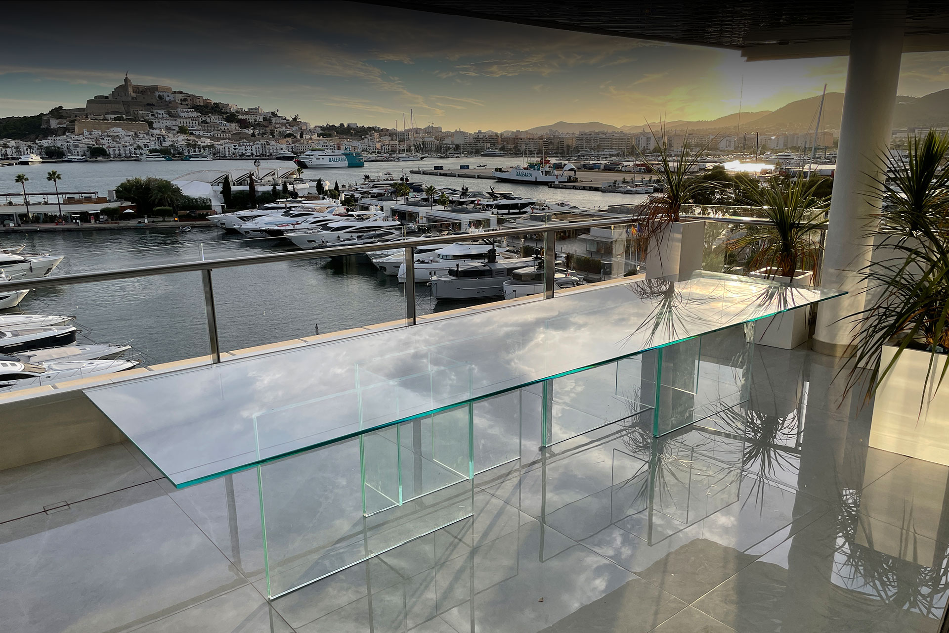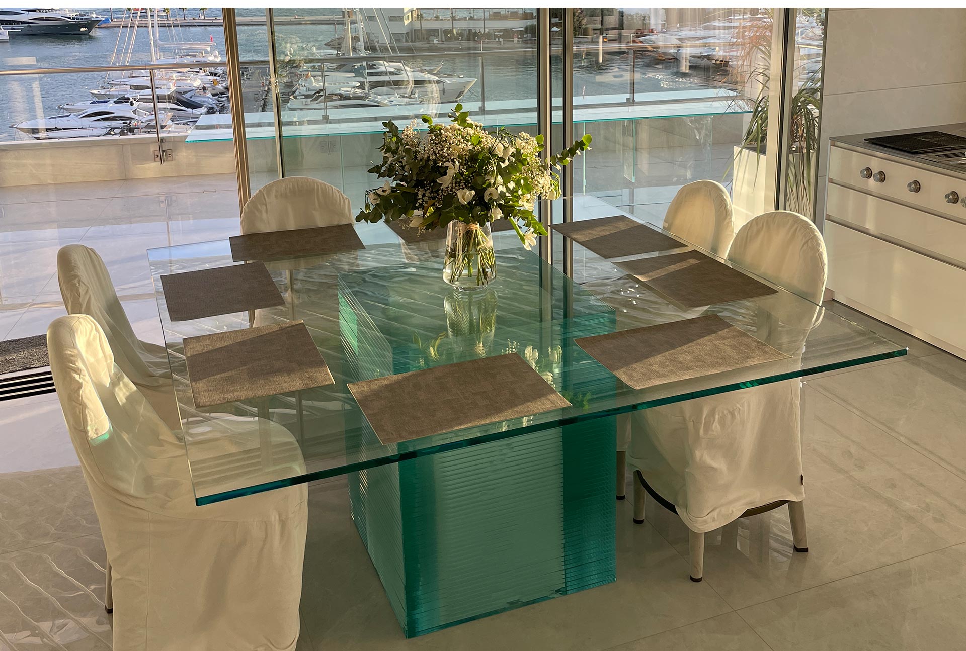 Per questa villa a Ibiza ci è stato richiesto di realizzare due tavoli in vetro, uno interno e uno esterno.